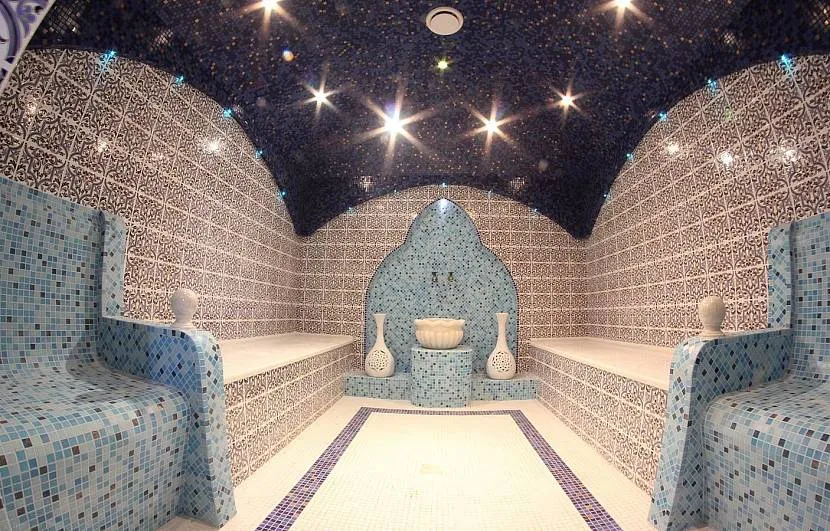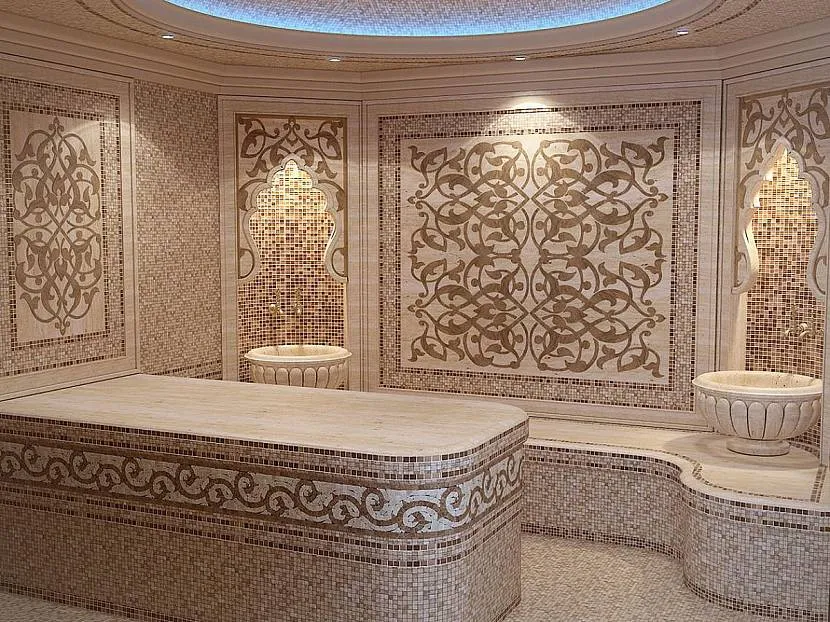 Интерьер современной восточной бани всегда практически полностью выполнен из камня, мозаики или плитки. Дерево не используют даже для отделки лежаков. Потолок парной имеет купольную форму. Это делается для того, чтобы конденсат с него не капал и не мешал посетителям, а стекал по стенам.