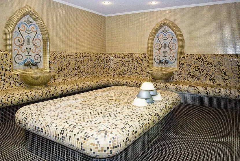 Хамам – очень мягкая и влажная парная. Температура достигает 45-55 градусов. Так как пар и температура в турецкой бане очень деликатны, посещать его можно почти всем: и беременным, и спортсменам с травмами, и людям с заболеваниями сердца и кровеносной системы (с разрешения врача). Противопоказан хамам при проблемах с венами и воспалениями на коже.