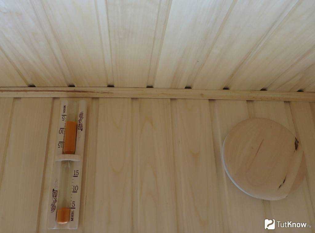 Под потолком сауны оборудуют вытяжной узел. Это может быть либо обычное отверстие с задвижкой для регуляции воздухообмена, либо вытяжной вентилятор.