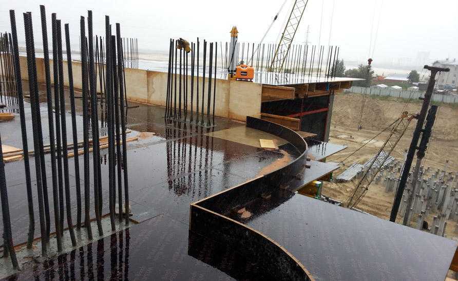 А вот если есть балконы, то тут придется делать чуть по другому. Для начала вам придется делать опалубку и под балконом, но с запасом хотя бы в 30 см больше. Вот на эту фанеру вы будете прибивать доску и к ней фанеру. Далее фанеру по краю крепите к арматурной сетке. Гораздо сложнее, если балкон или стена будет с радиусом. Фанера довольно гибкая, но на малых радиусах придется либо делать надрезы, либо использовать тонкую фанеру в 3-5 мм. Но тут уже нужно экспериментировать.