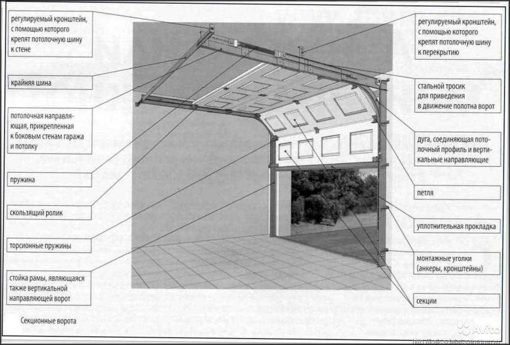 В секционных воротах основное отличие в том, что полотно состоит не из единого полотна, а из набора подвижно соединенных между собой секций. Скрепляются секции между собой специальными петлями, обеспечивающими должную степень свободы. Петель обычно по три на каждое соединение — по краям и в середине (при большой ширине ворот может быть больше). По краям каждой секции установлены ролики. По бокам проема ворот установлены направляющие, которые плавно изогнувшись, переходят в потолочную направляющую. Направляющие имеют выемки, в которые заправляются ролики.