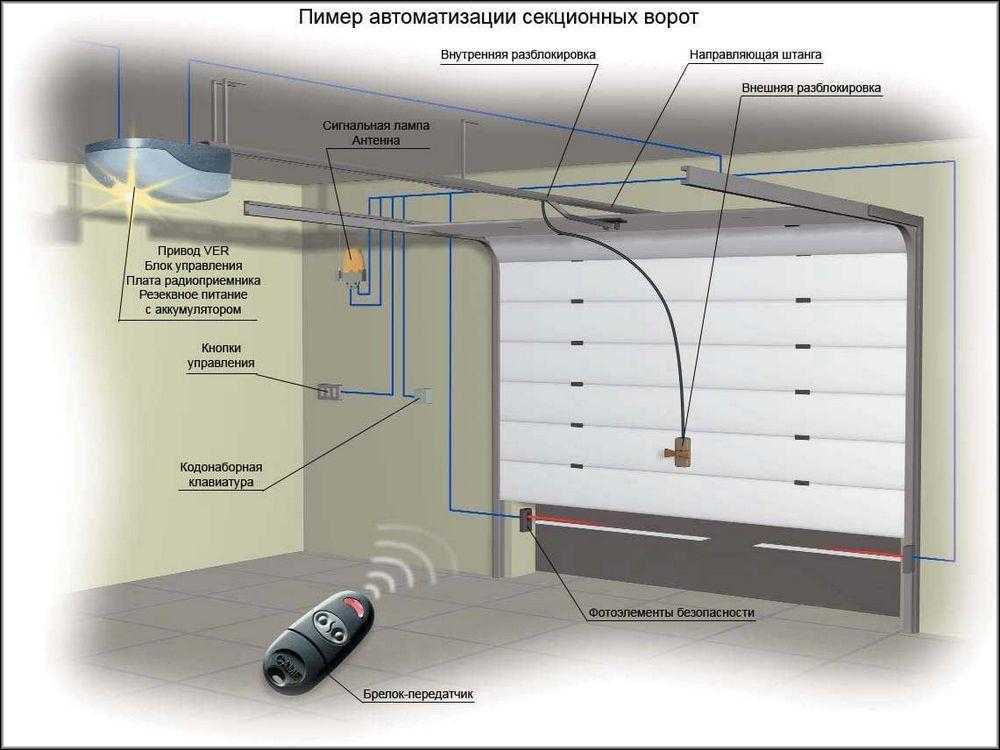 Практически все приводы для секционных гаражных ворот оборудованы подсветкой, которая включается при старте и выключается через установленный промежуток времени. Отличительной особенностью приводов данного вида является выполнение функции замка при закрытых воротах, что осуществляется связкой «планка привода – створка ворот». Именно поэтому гаражные ворота рекомендуется оборудовать ручной системой разблокировки (на случай отключения электроэнергии). Особенно актуально этот вопрос стоит, если в гараже отсутствует аварийный выход.
