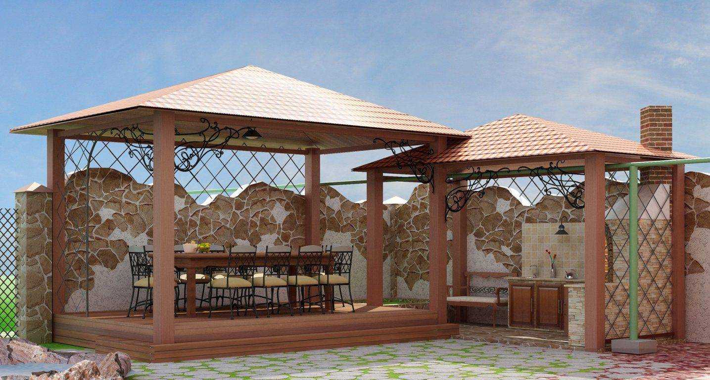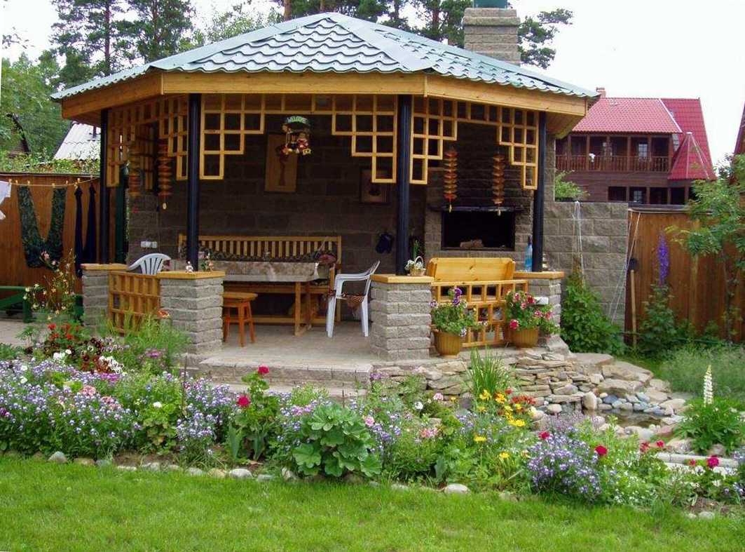 Данный вид постройки защищает от легких капризов погоды типа дождя или ветра, при этом можно наслаждаться всеми прелестями природы – пением птиц, цветочными ароматами, красивыми пейзажами. Внутри нее можно найти место для мангала или даже для полноценной печи.
