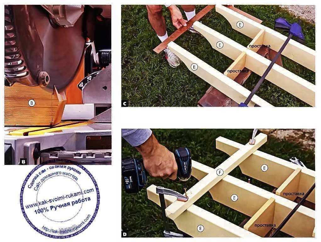 4. Нанесите водостойкий клей на торцы консолей В и прикрепите их шурупами к монтажным доскам А (рис. 1). Затем добавьте подкосы D, закрепив их таким же способом. Наконец, прикрепите снизу бобышки С.