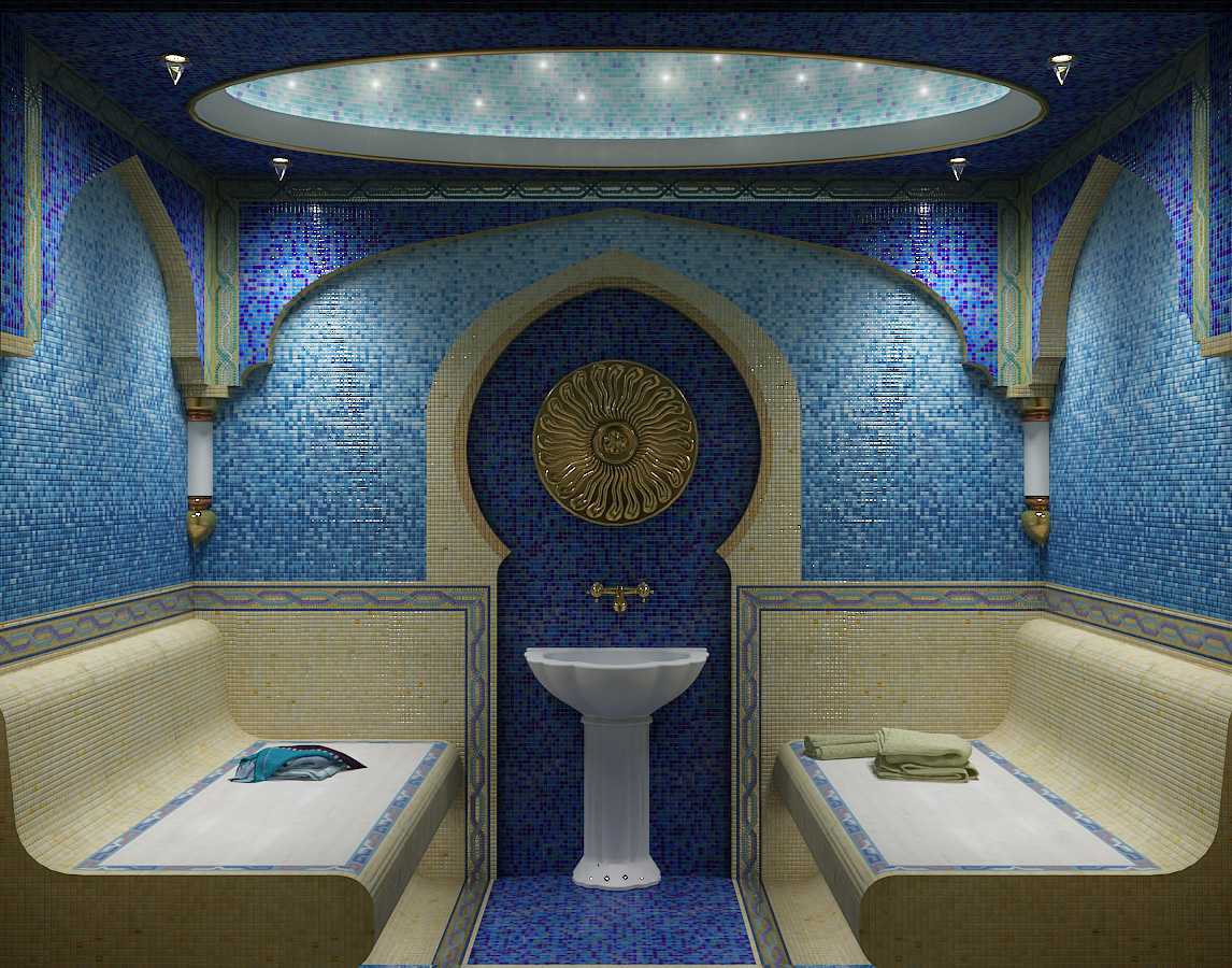 Традиционную баню в Турции строили в форме раскрытой ладони. Парная состояла из 5 помещений, которые строили в виде лучей вокруг главной комнаты: