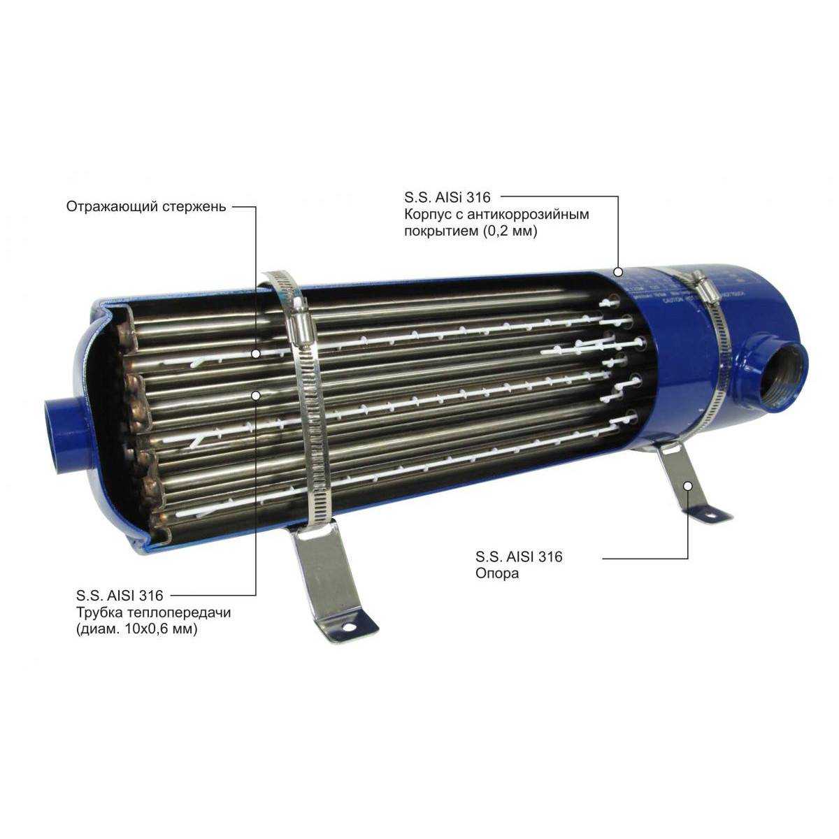 В этих установках процесс теплообмена происходит в межтрубной полости резервуара, в который поступает горячая вода из системы теплоснабжения. В этой полости находятся металлические трубки, внутри которых протекает жидкость из бассейна. Подогреваемая вода нагнетается с помощью насоса, поступает в приемный коллектор, проходит по системе трубок, а затем собирается выходном коллекторе.
