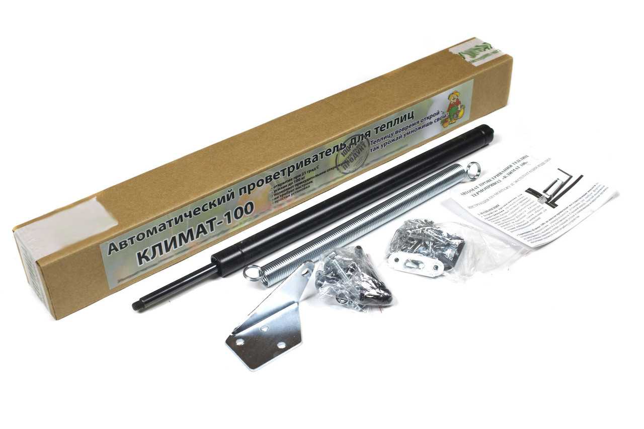 Климат 100 – это автоматический проветриватель для теплиц, который не нуждается в электричестве, полностью автономен и может использоваться с дверью весом до 100 кг. Когда температура воздуха в теплице поднимается выше +21 градусов, проветриватель начинает открывать теплицу, а при температуре +30 градусов дверь открывается полностью. Максимальный угол открытия створки составляет 90-100 градусов. Цена 1100 р.