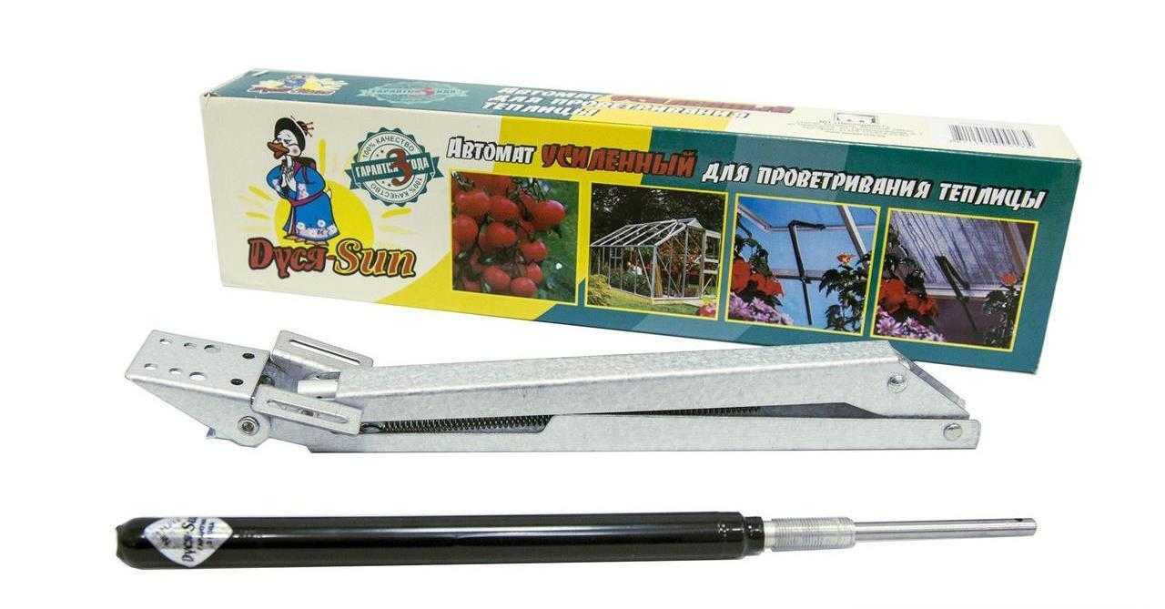 Автомат Дуся-Сан предназначен для проветривания теплицы и начинает работу при температуре от 15 до 25 градусов (значение можно настроить), выдерживая нагрузку не более 7 кг. Цена 2300 р.