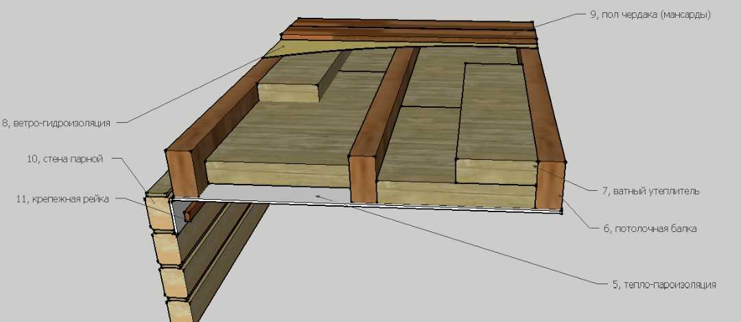 - к черновому потолку изнутри прикрепите брусья обрешетки, разместив между ними плиты из базальтовой ваты;
